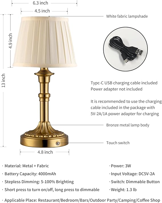 - 【Metal Material】 This table lamp is 13 inches high, 6.3 inches wide and weighs 1.3 pounds in a compact size. Whether you are studying, reading or working, it doesn’t take up much space but provides plenty of illumination light. The body is made of metal with an electroplated finish for a smooth, textured look. Fabric lampshade with good light transmission.