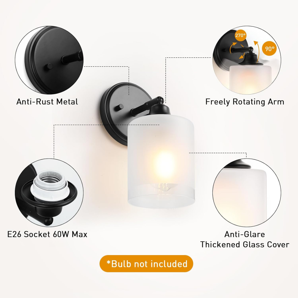 - Elegant Black Bathroom Vanity Light with Frosted Glass Shade: Each wall sconce set of 2 features a premium matte black finish and frosted glass shade for a soft, non-glare glow. The transparent glass edge enhances the light diffusion, making it ideal for bathroom lighting fixtures over mirror, vanity lights for bathroom, or any stylish interior upgrade.